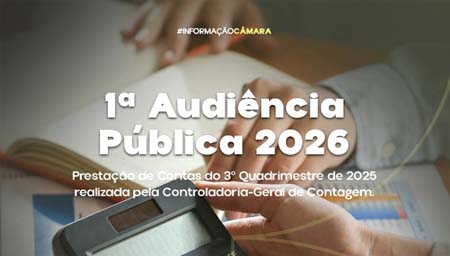 A Câmara Municipal de Contagem recebe, na próxima quinta-feira (26/02), às 10h, a 1ª Audiência Pública de prestação de contas do Município em 2026, relativa ao 3º quadrimestre de 2025. Realizada pela Controladoria-Geral de Contagem, a audiência será acompanhada pela Comissão de Finanças, Orçamento e Tomada de Contas da Câmara, e é uma oportunidade para que a população acompanhe de perto as ações da Prefeitura e a aplicação dos recursos públicos.